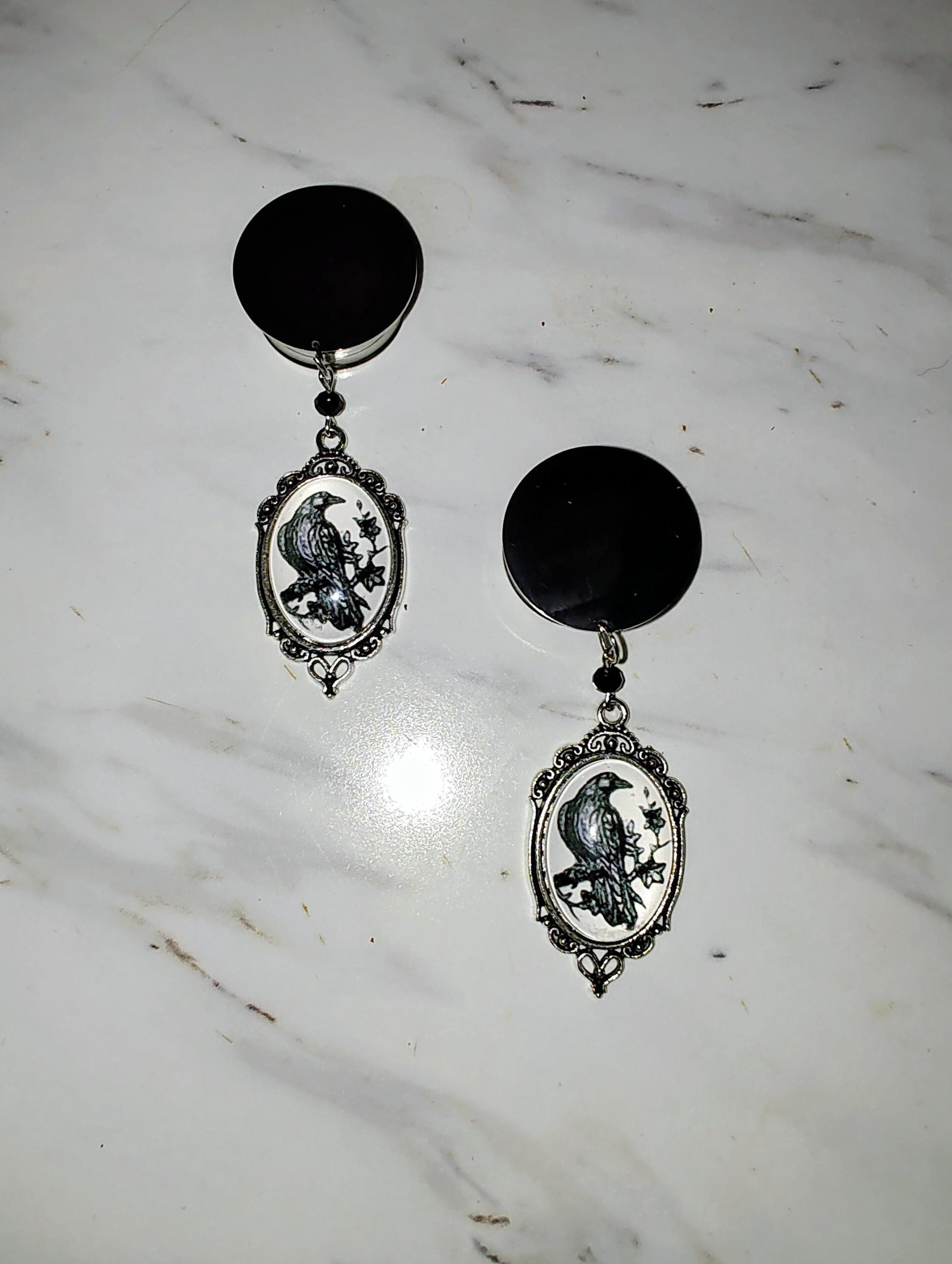 Beautiful raven charms paired with surgical stainless-steel screw‑back tunnels or plugs.
