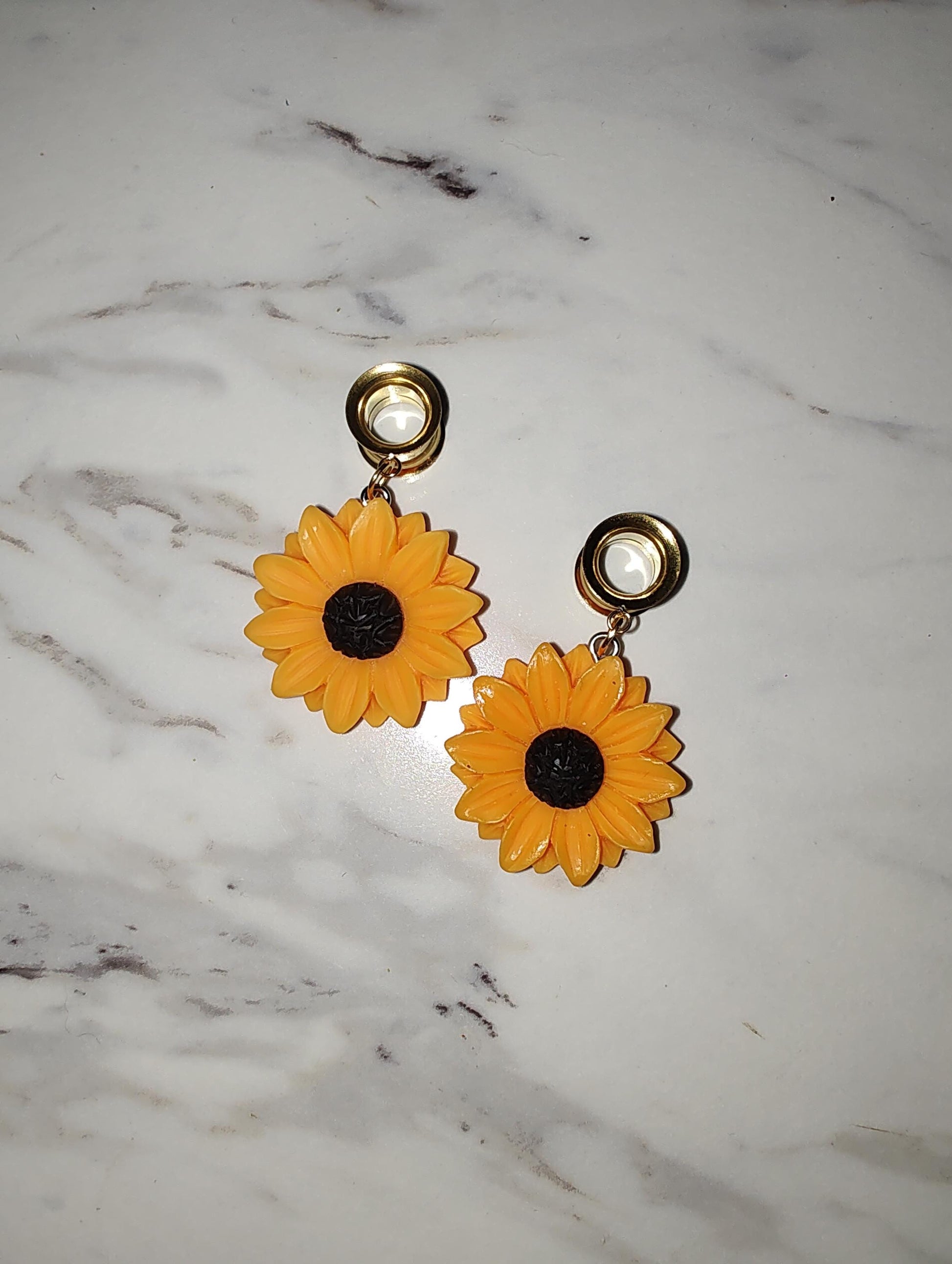Adorable sunflower charms paired with surgical stainless steel gold colored screw‑back tunnels or plugs.